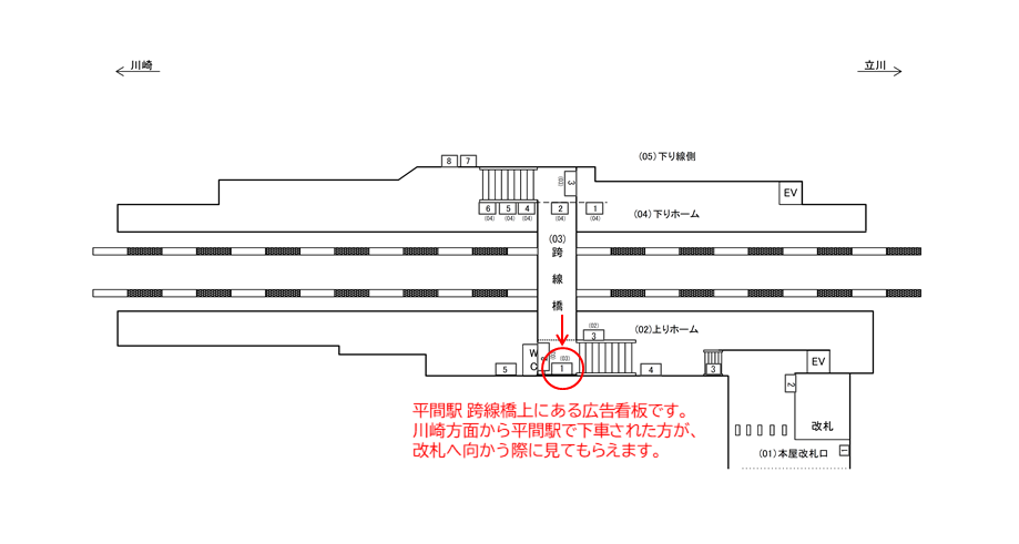 跨線橋上にある広告看板です。川崎方面から平間駅で下車された方が、改札へ向かう際に見てもらえます。