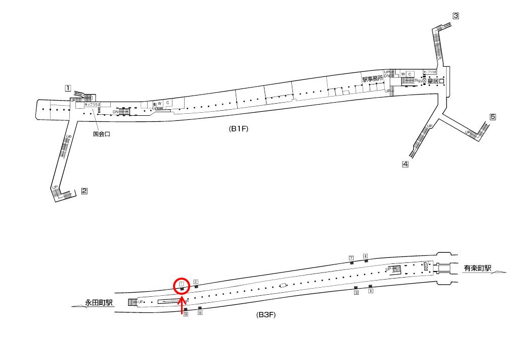 国会口改札への階段にほど近い場所にございます。