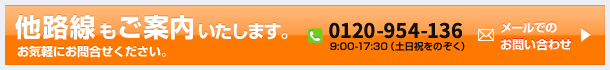 他路線ご案内もいたします。 お気軽にお問合せください。 0120-954-136 9:00-17:30(土日祝をのぞく) メールでのお問い合わせ