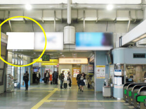改札内の上部に掲載する大型フラッグ広告で、駅構内の象徴的な位置に掲載する事で多くの注目を集める展開が可能です。頭上に吊り下げられるフラッグ広告は混雑時でも視認性を阻害することがなく、遠くからも見せる事ができます。