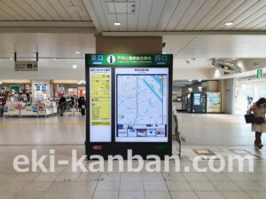 戸田公園駅 の改札を出た駅敷地内に設置された地図広告です。戸田公園駅 西口・東口を基点に周辺地図(所在地表記)・インデックス(下段の索引)・写真面(フリースペース)を掲載する広告商品です。戸田公園駅で下車されて目的地を探される方、駅近隣の店舗施設情報を知りたい方への広告に有効です。