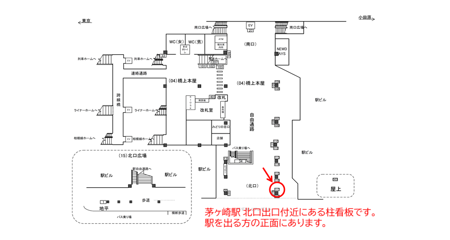 改札を出て右側の北口出口付近にある柱看板です。茅ヶ崎駅の北口はペデストリアンデッキになっていてそのままデッキへ出られます。この広告看板はそのデッキに出る直前の柱面についていて、駅を出る方に正対する面にあります。駅周辺の施設案内に適した広告看板です。