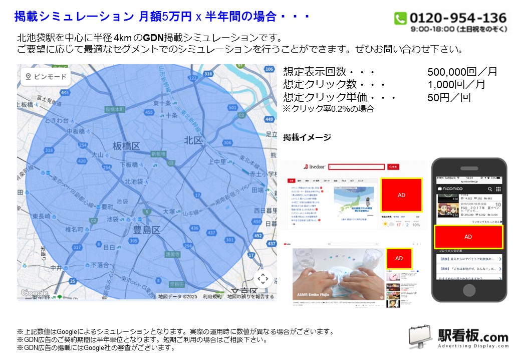 東武 北池袋駅 を中心に、ご指定の半径(km)を対象に、パソコンやスマートフォンを閲覧している方に向けて配信できるディスプレイ(バナー)広告です。Googleと提携しているサイトやアプリ または Yahoo!JAPANや提携サイトの広告枠に配信できるディスプレイ(バナー広告)で、駅利用者や電車利用者、指定半径内を移動している方や、勤務・居住している方に向けて企業や製品・サービスなどを訴求できます。