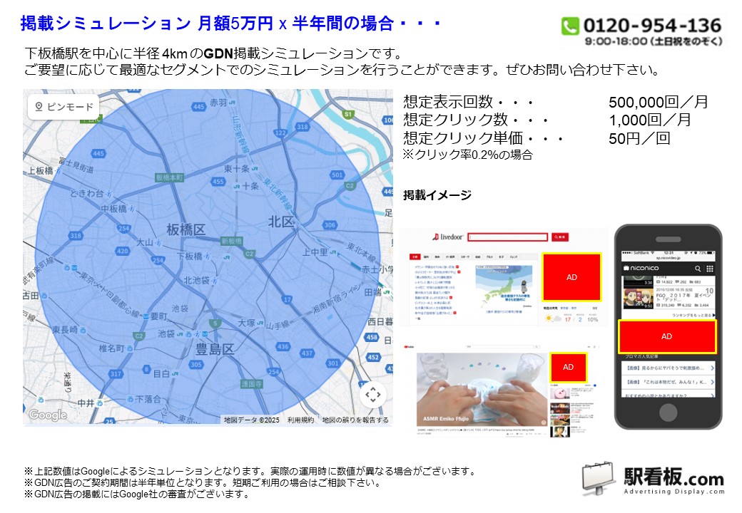 東武 下板橋駅 を中心に、ご指定の半径(km)を対象に、パソコンやスマートフォンを閲覧している方に向けて配信できるディスプレイ(バナー)広告です。Googleと提携しているサイトやアプリ または Yahoo!JAPANや提携サイトの広告枠に配信できるディスプレイ(バナー広告)で、駅利用者や電車利用者、指定半径内を移動している方や、勤務・居住している方に向けて企業や製品・サービスなどを訴求できます。