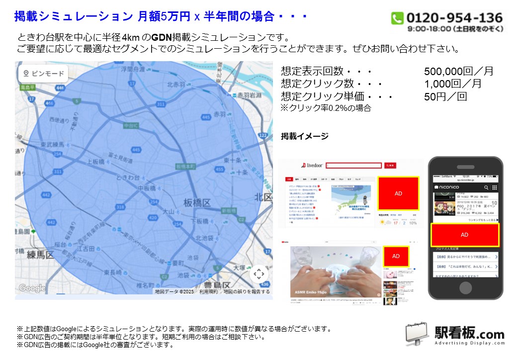 東武 ときわ台駅 を中心に、ご指定の半径(km)を対象に、パソコンやスマートフォンを閲覧している方に向けて配信できるディスプレイ(バナー)広告です。Googleと提携しているサイトやアプリ または Yahoo!JAPANや提携サイトの広告枠に配信できるディスプレイ(バナー広告)で、駅利用者や電車利用者、指定半径内を移動している方や、勤務・居住している方に向けて企業や製品・サービスなどを訴求できます。