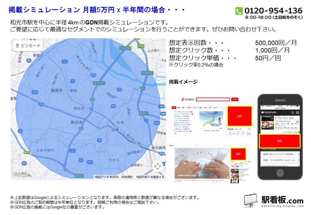 東武 和光市駅 を中心に、ご指定の半径(km)を対象に、パソコンやスマートフォンを閲覧している方に向けて配信できるディスプレイ(バナー)広告です。Googleと提携しているサイトやアプリ または Yahoo!JAPANや提携サイトの広告枠に配信できるディスプレイ(バナー広告)で、駅利用者や電車利用者、指定半径内を移動している方や、勤務・居住している方に向けて企業や製品・サービスなどを訴求できます。