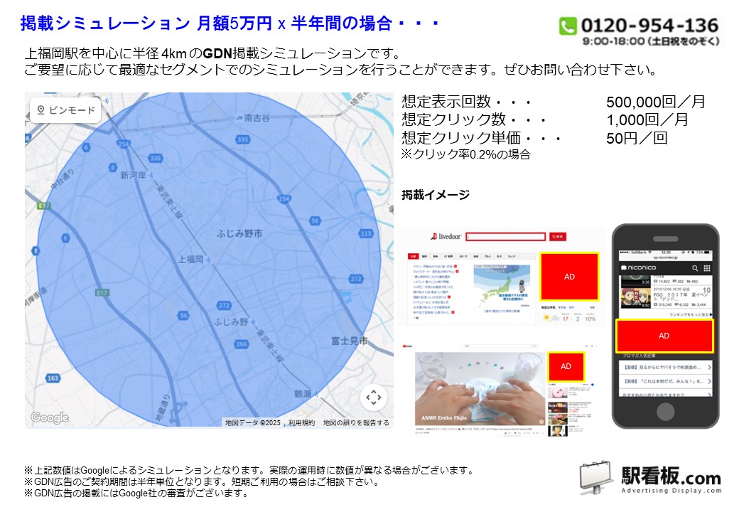 東武 上福岡駅 を中心に、ご指定の半径(km)を対象に、パソコンやスマートフォンを閲覧している方に向けて配信できるディスプレイ(バナー)広告です。Googleと提携しているサイトやアプリ または Yahoo!JAPANや提携サイトの広告枠に配信できるディスプレイ(バナー広告)で、駅利用者や電車利用者、指定半径内を移動している方や、勤務・居住している方に向けて企業や製品・サービスなどを訴求できます。