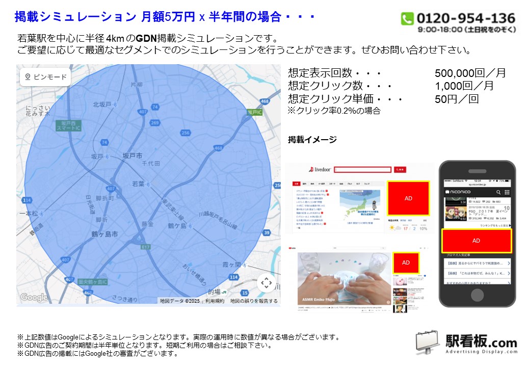 東武 若葉駅 を中心に、ご指定の半径(km)を対象に、パソコンやスマートフォンを閲覧している方に向けて配信できるディスプレイ(バナー)広告です。Googleと提携しているサイトやアプリ または Yahoo!JAPANや提携サイトの広告枠に配信できるディスプレイ(バナー広告)で、駅利用者や電車利用者、指定半径内を移動している方や、勤務・居住している方に向けて企業や製品・サービスなどを訴求できます。