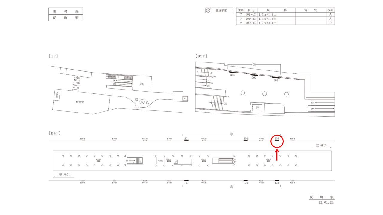 ・東急東横線(横浜方面)線路前、先頭車両の停車位置付近、同列最奥の看板です。
