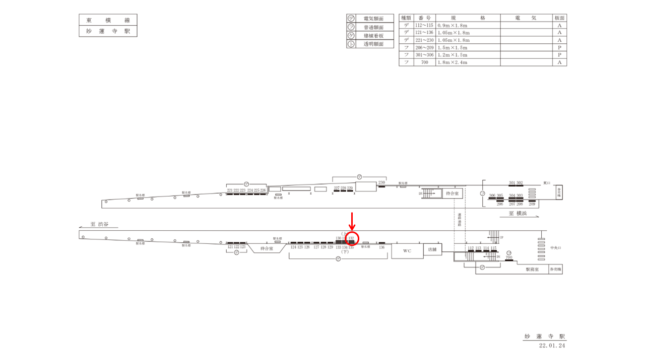 本媒体は東急東横線(渋谷方面)ホーム、中間車両停車位置付近のホーム上に設置されています。渋谷寄りの奥から12基目、二基縦並びのうち、上の看板です。