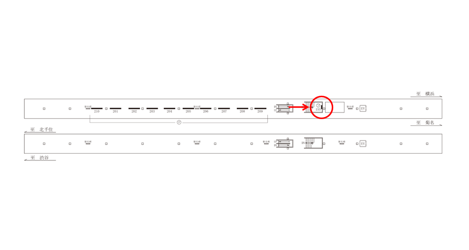 本媒体は、中目黒駅の東横線ホーム(横浜方面)から改札内コンコースへ向かう階段上に設置された看板です。ホームから降りる際、最初に目に入る位置にあり、乗降客の主要な動線上に配置されています。