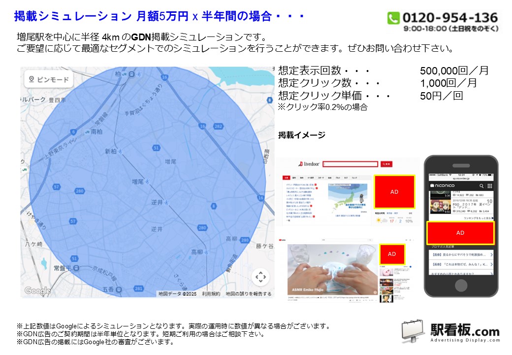 東武 増尾駅 を中心に、ご指定の半径(km)を対象に、パソコンやスマートフォンを閲覧している方に向けて配信できるディスプレイ(バナー)広告です。Googleと提携しているサイトやアプリ または Yahoo!JAPANや提携サイトの広告枠に配信できるディスプレイ(バナー広告)で、駅利用者や電車利用者、指定半径内を移動している方や、勤務・居住している方に向けて企業や製品・サービスなどを訴求できます。