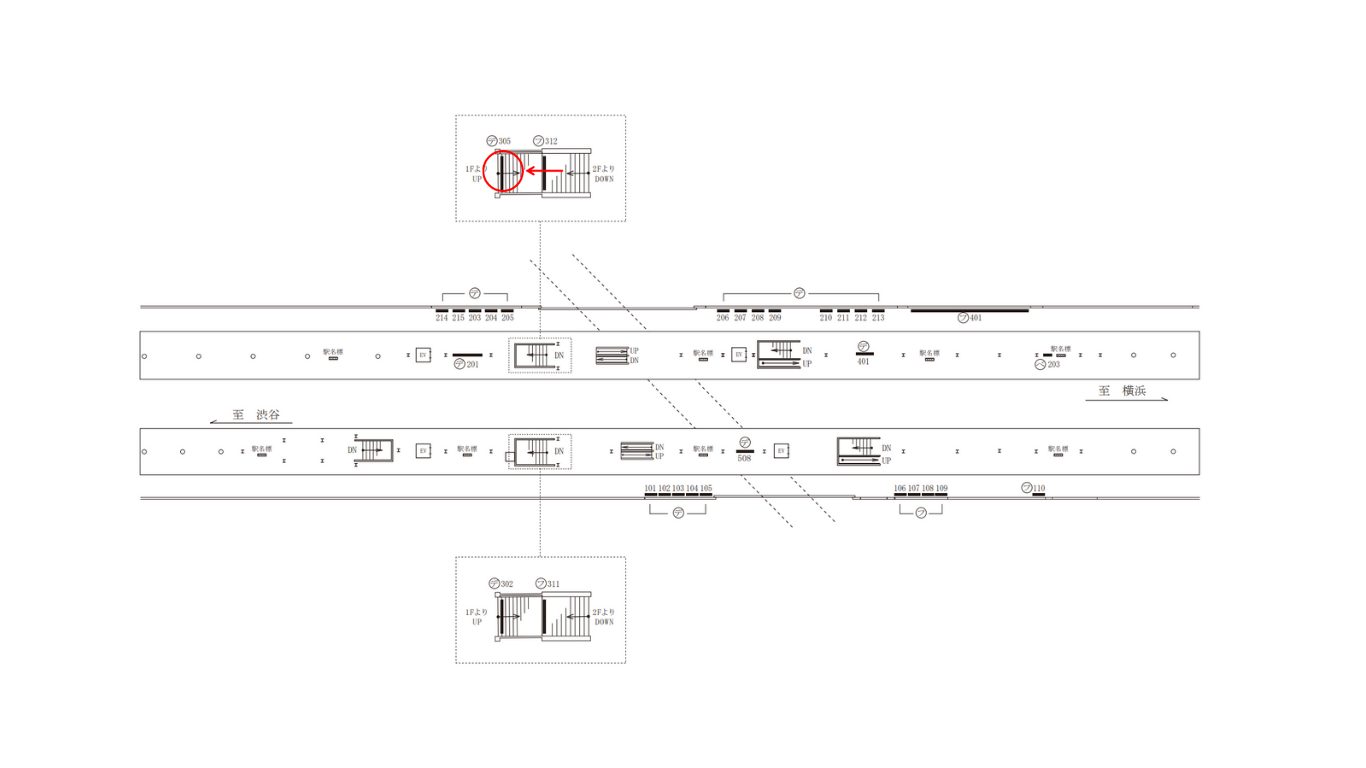 本媒体は、東横線ホーム(横浜方面)から改札階へ下りる際の階段上部に設置された看板です。