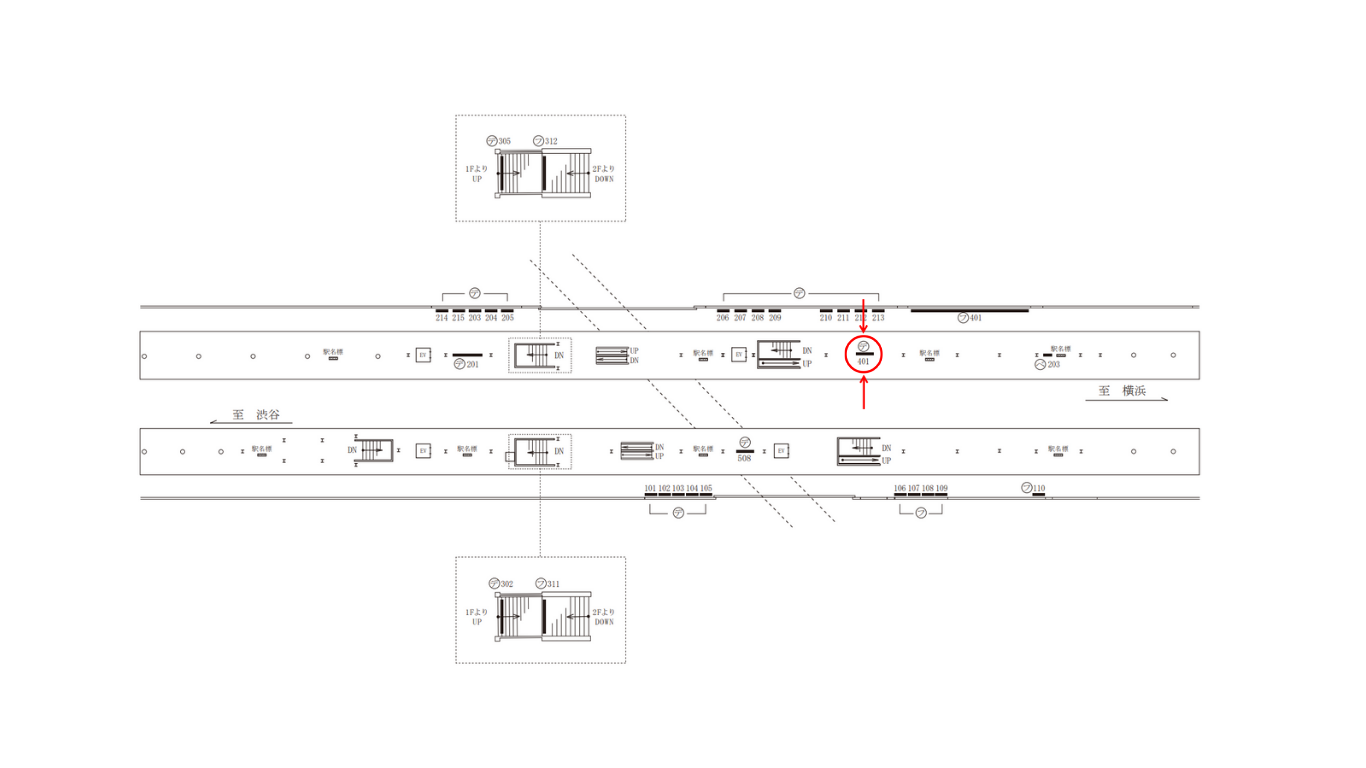 本媒体は、東横線ホーム上(横浜方面)中間~前方車両停車位置付近の上部に設置された両面看板です。