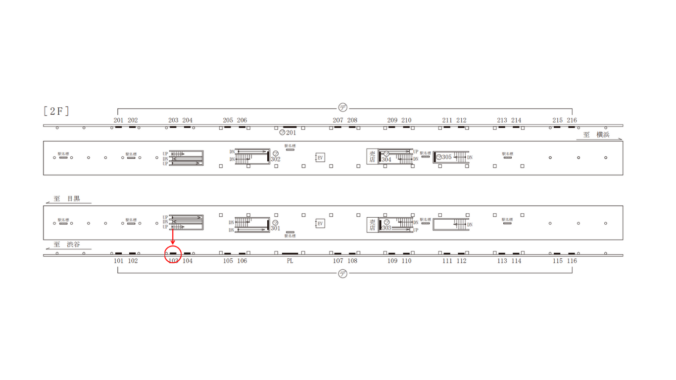 ○電気額面№104 線路前(東急東横線 渋谷方面ホーム JR線方面改札側) |