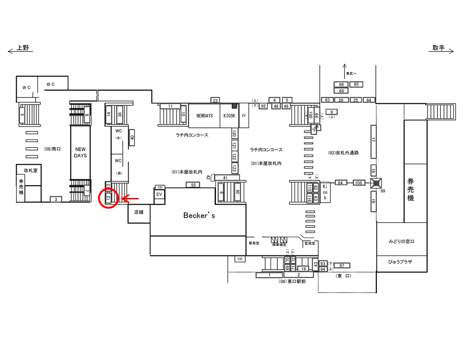 改札内コンコース。常磐線各駅停車ホームに降りる際の階段正面に設置された電飾タイプの広告看板です。正面に見せる看板は企業広告やサービス周知に有用です。主に柏駅から北千住・千代田線 代々木上原方面への電車を利用される方への広告として、常磐線沿線や柏駅周辺施設への誘導案内や企業告知などにご活用ください。