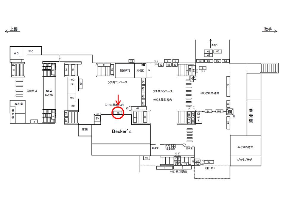 ○本屋改札内№38 改札内コンコース(ホーム階段正面 常磐線 快速・特急ホーム) |