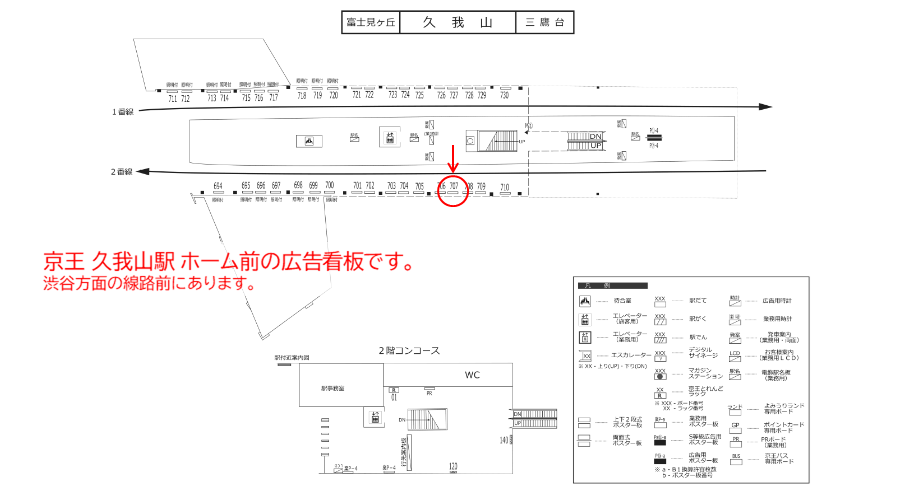 久我山駅のプラットホームは京王井の頭線の2線1面の島ホームで、駅看板「京王 久我山駅 駅だて№707」は渋谷方面の電車が停車する2番線の線路前にあります。久我山駅から明大前・下北沢・渋谷方面の電車を待つ方に正対する位置にあります。