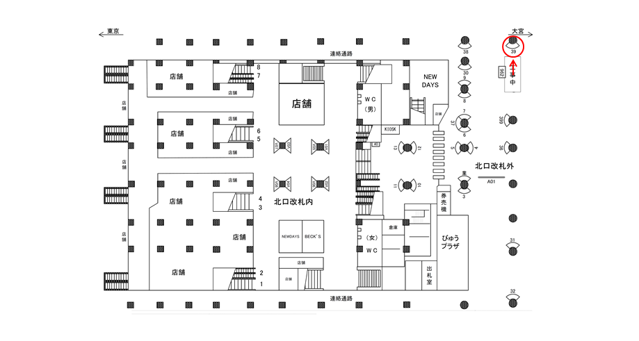 改札は北改札口と南改札口の地上2箇所、ホームは高架上層階に島ホーム4面(京浜東北線上下/宇都宮線・高崎線・上野東京ライン/宇都宮線・高崎線・湘南新宿ライン/埼京線の各ホーム)ございます。北口改札外は東西に抜けており、バス利用者や駅周辺を行き交う方々の自由通路としても機能しています。