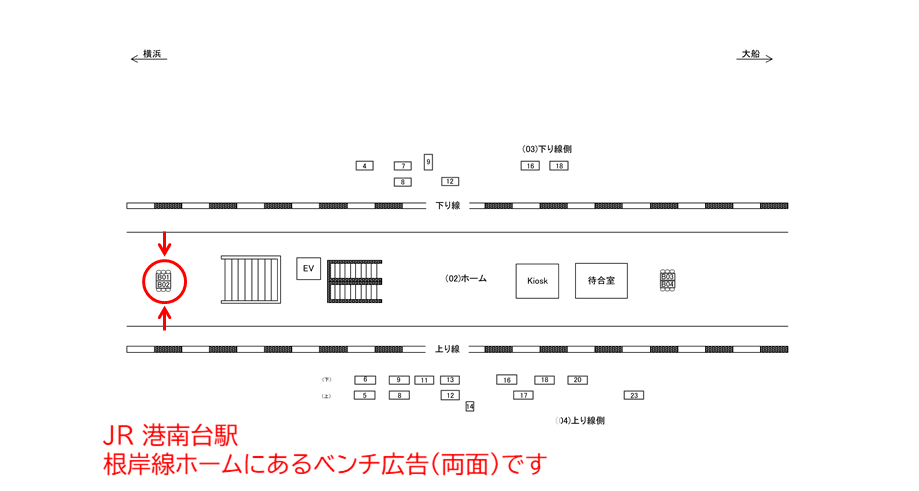 根岸線ホームベンチの背もたれ部分を使用する広告看板で、ベンチ利用者やホームで電車をお待ちになる方、港南台駅で下車される方を対象とした広告としてご利用になれます。