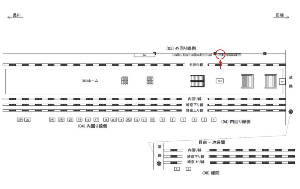 ○外回り線側№110 線路前(JR山手線外回り 池袋・上野・東京方面) |