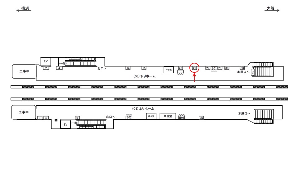 改札は北口側改札と南口側改札の2箇所、ホームは京浜東北線・根岸線と横浜線が停車する相対式ホームが2面あります。