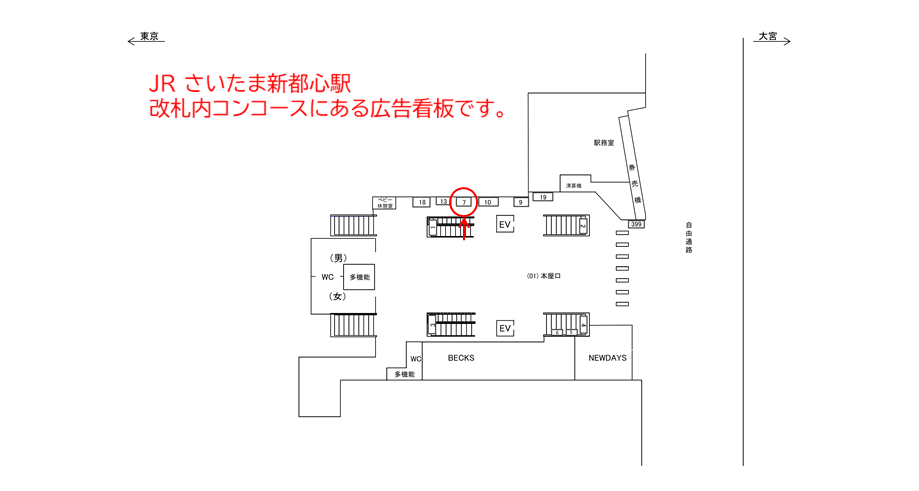 JR さいたま新都心駅、コンコースの駅広告設備(駅看板)のご紹介です。