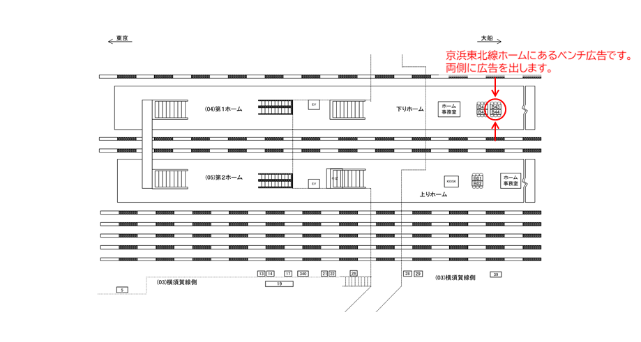 京浜東北線・根岸線ホーム上のベンチ背もたれ部分を使用した広告看板です。主にベンチを利用される方やホーム上で乗車をお待ちになる方にご覧頂けます。