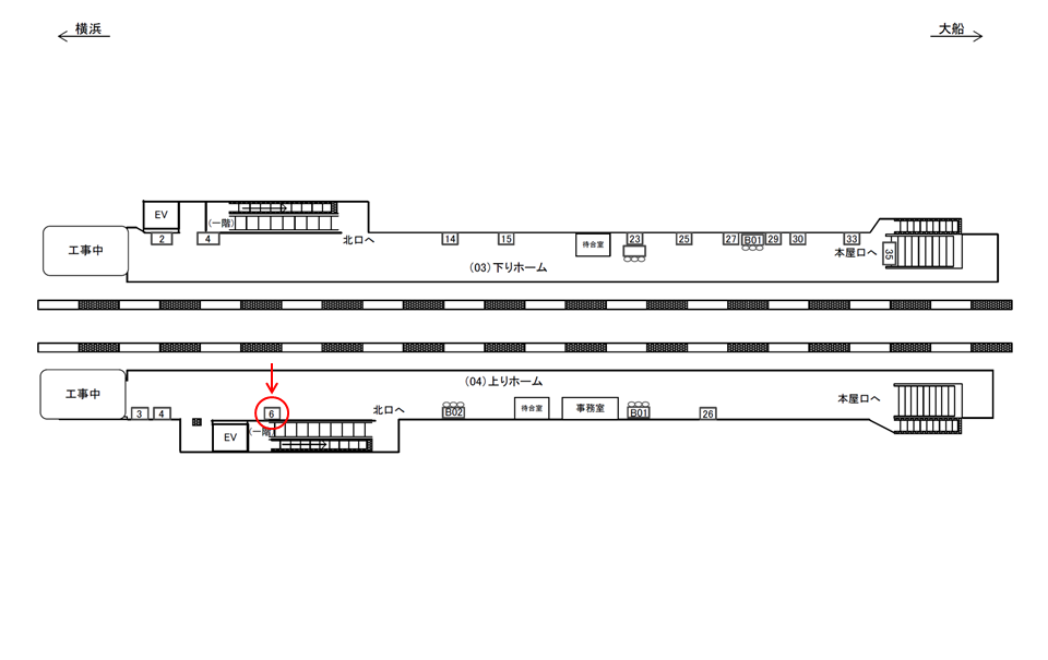駅看板「JR 関内駅 上りホーム№6」はホームの中でも北口改札寄りにある看板です。関内駅を利用される方の中でも北口改札を使う方を対象とした広告に向いています。
