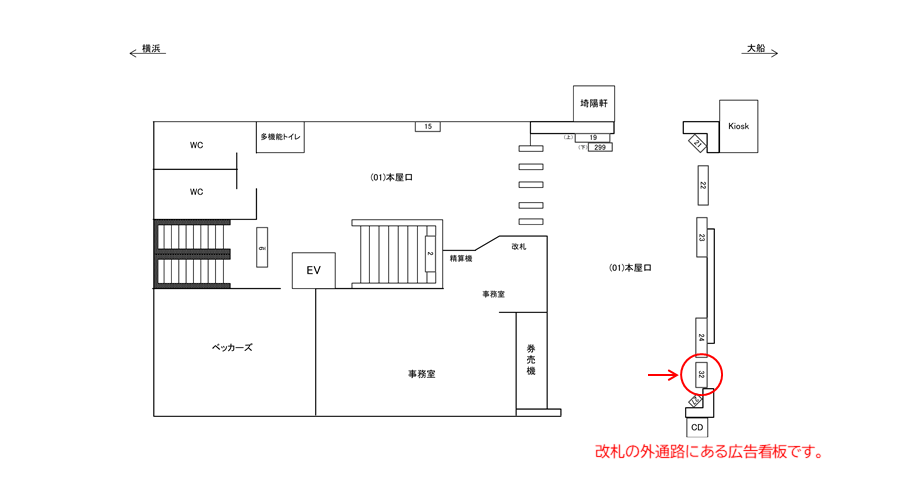 洋光台駅の外通路にある広告看板です。駅の出口付近にあり、近隣施設の案内に利用しやすい場所にあります。