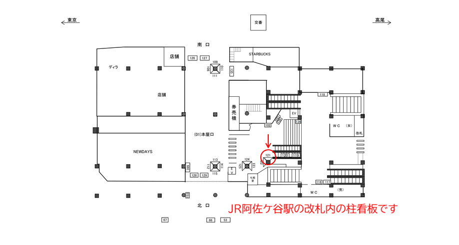 JR阿佐ケ谷駅の改札内にある柱看板です。メイン改札に近い場所にあり、電車利用者の多くはこの柱看板の前を通行します。