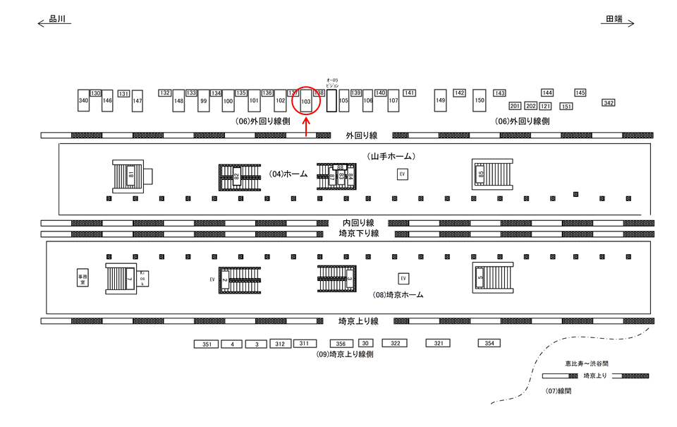 ○外回り線側№105 線路前(JR山手線外回り 渋谷・新宿・池袋方面) |