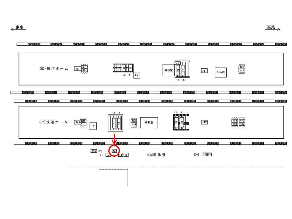 中央線快速のプラットホームには、改札階へ下りるエスカレーターと階段が一箇所ずつ、エレベーターが一基あります。駅看板「JR 高円寺駅 風防壁№13」は階段下り口のそばに設置されています。