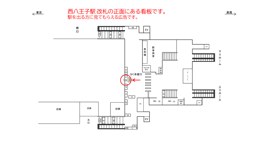 JR西八王子駅の改札を出た正面にある広告看板です。西八王子駅で下車し、駅を出ていく方を対象とした広告です。西八王子駅の改札口はこちら1箇所のみです。駅を利用する方はこの改札を利用しますので、他の広告と比べて広告接触してもらいやすい広告ロケーションです。