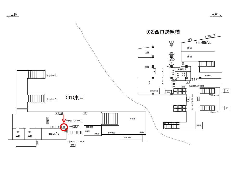 東口側の改札内に設置された電飾タイプの広告看板で、常磐線快速ホーム(3~6番線)から改札へ向かう際にこの看板があります。各駅停車ホームの階段とは反対側の通路となります。常磐線快速を使う方のみ駅看板「JR 取手駅 東口№33」がある通路を行き来します。