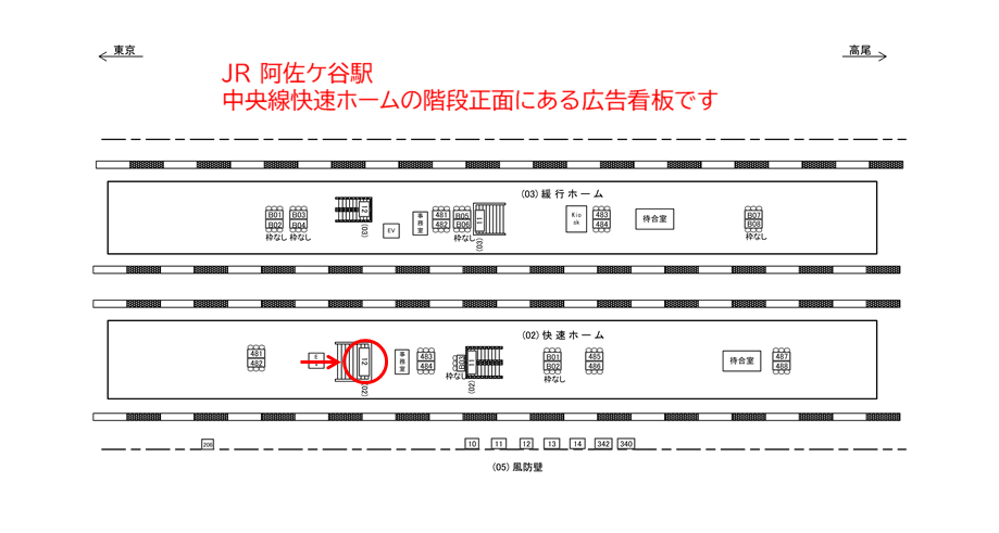 駅看板「JR 阿佐ヶ谷駅 快速ホーム№12」はJR東日本 阿佐ヶ谷駅の中央線快速ホームの階段正面に設置された電飾タイプの広告看板です。