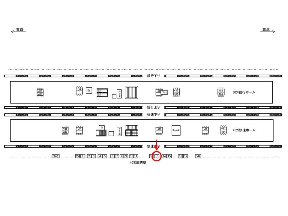 駅看板「JR 西荻窪駅 風防壁№13」はホームの中でもちょうど中央付近にあります。改札とホームをつなぐ階段とエスカレーターのそばにあり、駅利用者が電車待ちで滞留してもらいやすいエリアの広告です。西荻窪駅から都心方面へ向かう方向けに適した広告です。