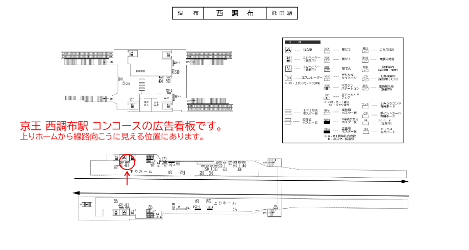 京王線ホームの上部に設置された電飾タイプの広告看板です。主に反対側の上りホームで電車をお待ちになる方にご覧頂ける場所にございます。通勤通学をはじめ、日々西調布駅を利用される方へのご案内にご利用ください。