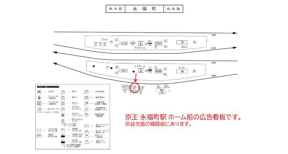 井の頭線のホーム前にある広告看板です。明大前・下北沢・渋谷方面へ向かう線路前となります。