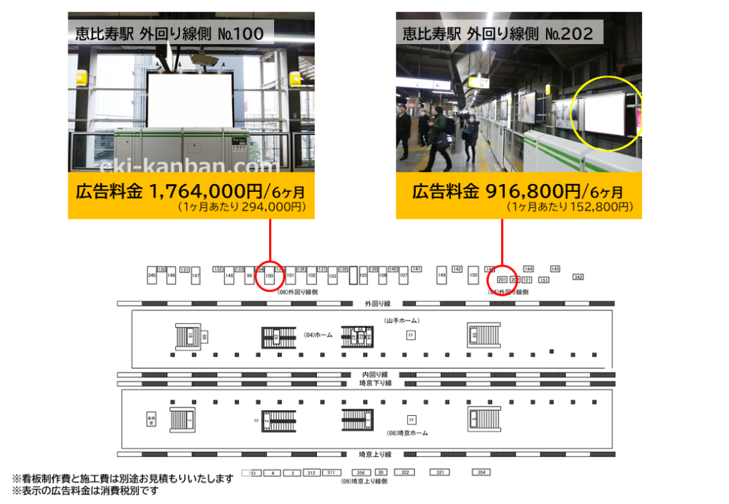 ○外回り線側№100 線路前(JR山手線外回り 渋谷・新宿・池袋方面) |