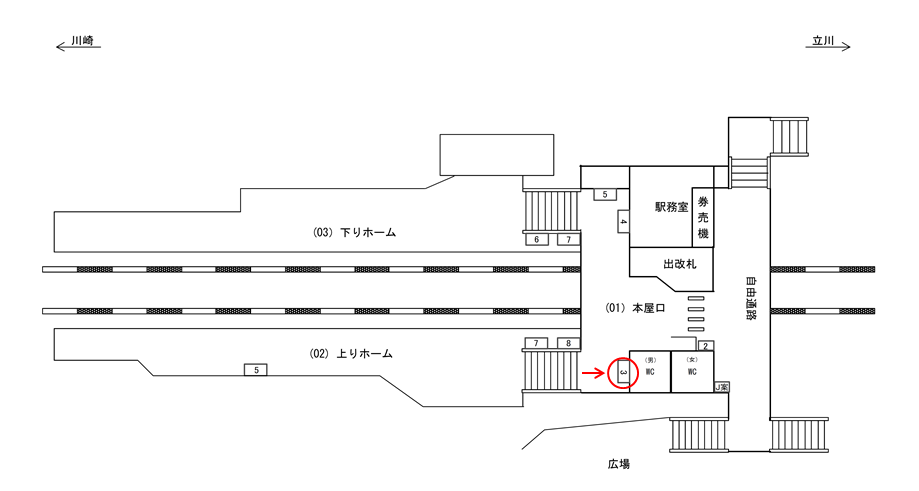 JR谷保駅 改札内通路に位置し、改札通過後、上りホームへ向かう階段付近、トイレの導線脇に設置された看板です。