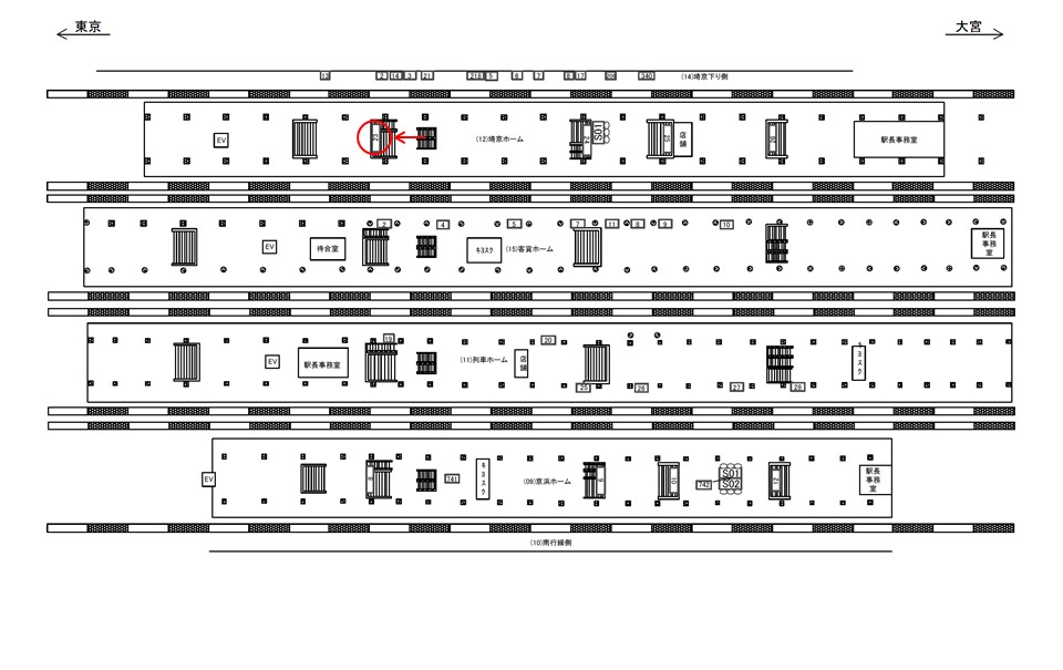 改札は北改札口と南改札口の地上2箇所、ホームは高架上層階に島ホーム4面(京浜東北線上下/宇都宮線・高崎線・上野東京ライン/宇都宮線・高崎線・湘南新宿ライン/埼京線の各ホーム)ございます。北口改札外は東西に抜けており、バス利用者や駅周辺を行き交う方々の自由通路としても機能しています。
