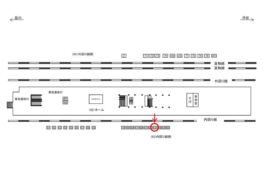 ○内回り線側№64 線路前(JR山手線 内回り 品川・東京・上野方面) |