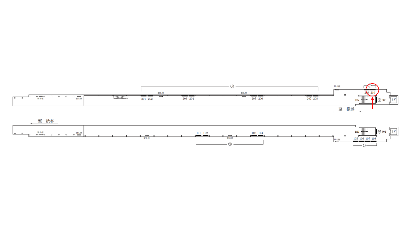 本媒体は、東横線ホーム上(横浜方面)の壁面に設置されています。前方車両停車付近、ホーム階へ下りる階段横に位置する看板です。