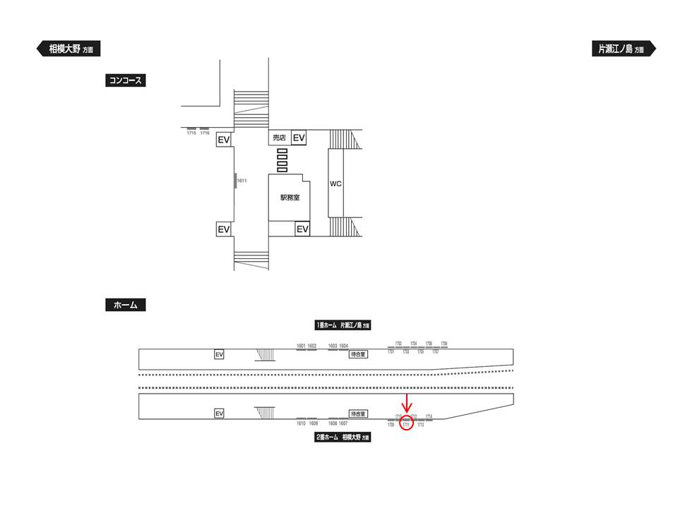 上りホーム(相模大野・新宿・千代田線方面)で電車をお待ちになる方に、線路を挟む形で正対する位置にございます。