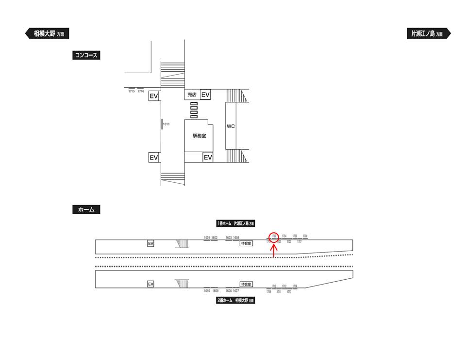 上りホーム(相模大野・新宿・千代田線方面)で電車をお待ちになる方に、線路を挟む形で正対する位置にございます。