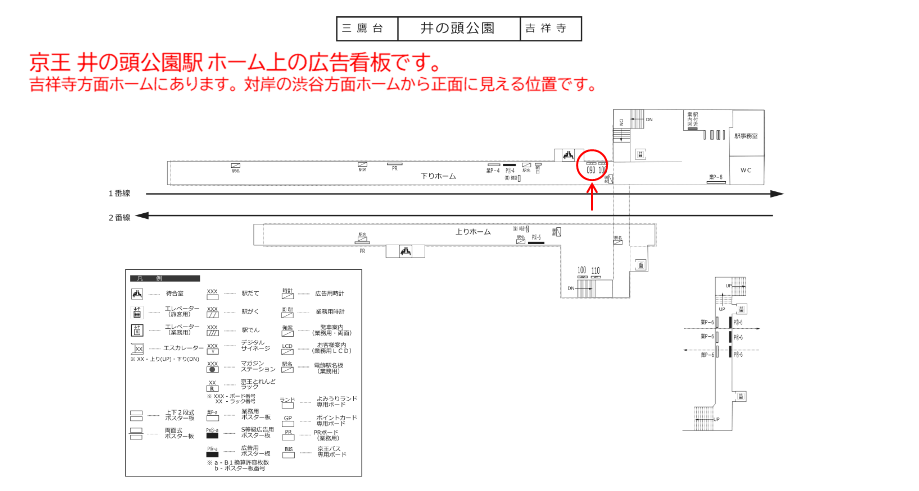 主に対岸の上り方向ホームにいる方に線路を挟む形で正面に見える位置にあります。井の頭公園駅から明大前・下北沢・渋谷方面の電車をお待ちになる方々向けの広告です。