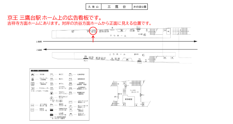 三鷹台駅の京王井の頭線のプラットホームは上り下りのホームが向きあう相対式の二面ホームです。この看板は下り方向ホームの背中壁面に設置されています。