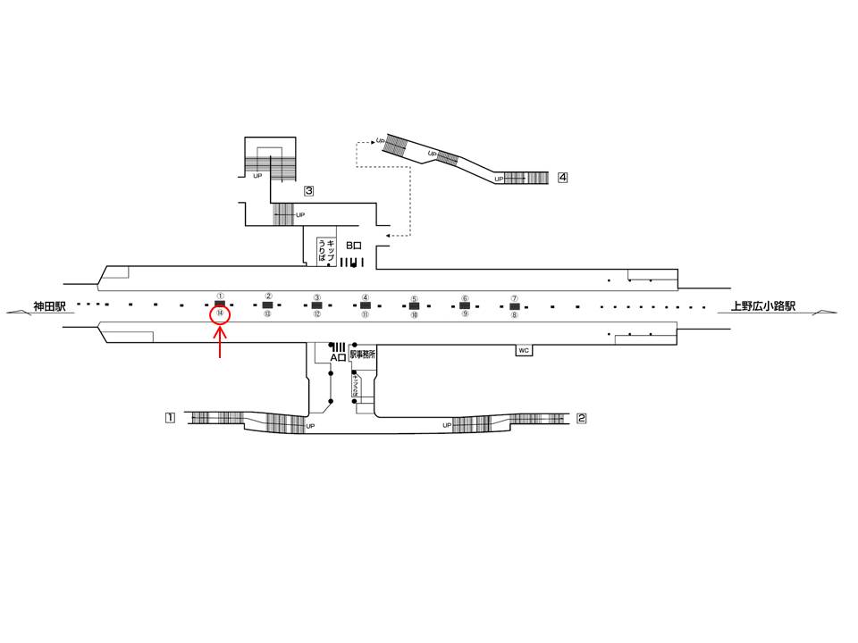 サインボード「銀座線 末広町駅 №14」はホーム先頭の神田寄りにございます。