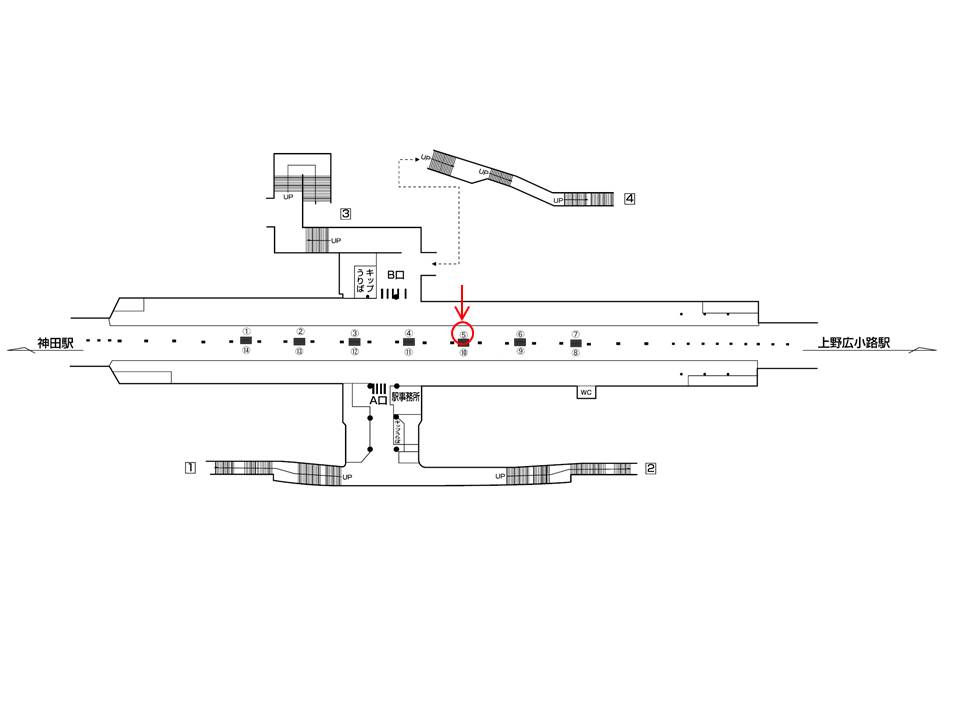 サインボード「銀座線 末広町駅 №5」はホーム中ほどにございます。